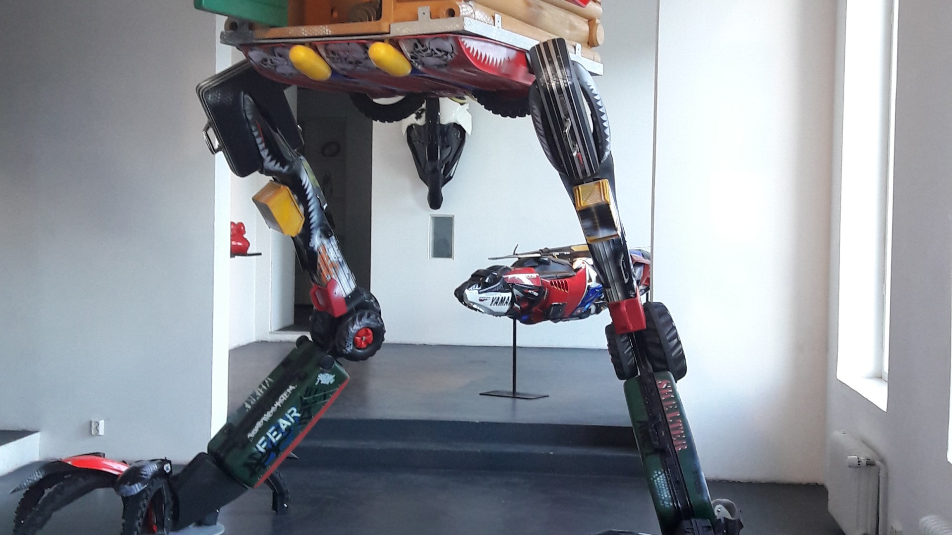 Recycled toys, suitcases, crashed motorcyckle parts, steel